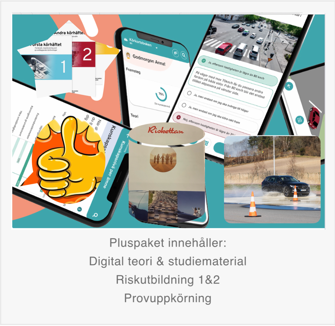 Kompletterar du med Pluspaketet kan du förbereda din intensiva körträning med teori ett par veckor i förväg med hjälp av Körkortsboken.se, med pluspaketet får du även försäkringen DriveSafe!